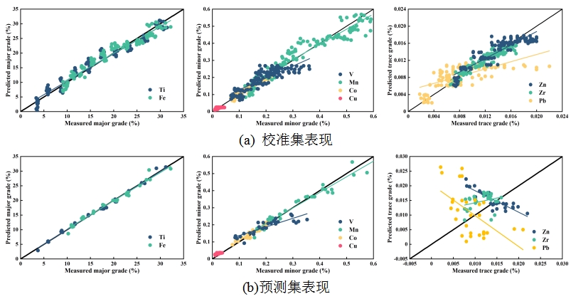 從iPLS-VCPA-IRIV特征選擇的擬合光譜數(shù)據(jù)圖(圖6)可以看出,在校正集中,鈦鐵礦多組分品位都均勻準確地分布在理想曲線上。然而,對于預測集來說,明顯可以看出來的是,除擬合良好的主要品位(Ti、Fe)和次要品位(V、Mn、Co、Cu)外,微量品位(Zn、Zr、Pb)的擬合似乎并不令人滿意。因此,在下一步工作中,可以對少樣本量下礦石內(nèi)部微量品位的變化進行更深入的研究。