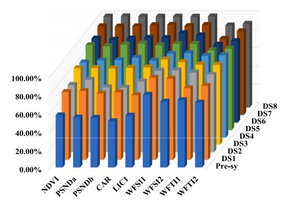 圖4. 基于植被指數(shù)和機(jī)器學(xué)習(xí)分類器的小麥赤霉病平均分類精度對(duì)比圖