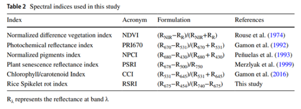 藍色波段在疾病監(jiān)測中的貢獻:藍色波段在疾病監(jiān)測中的重要性得到了證實,因為只有RSRI和NPCI在抽穗階段(感染的早期階段)的DS量化中達到了可接受的準確性。藍色區(qū)域的反射率特征是主要色素的吸收重疊。因此,藍色反射率應(yīng)對由病原體感染引起的微妙生化變化敏感。例如,藍色光譜特征可以記錄在早期應(yīng)激階段,衰老和不健康植物中常見的葉綠素含量的減少。此外,藍色波段對稻穗成熟的不敏感性可能部分解釋了RSRI在不同生長階段對DS的一致敏感性(Figs. 7, 8)。