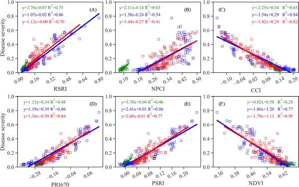 圖6. DS(疾病嚴重度)與SIs(光譜指數(shù))之間的關(guān)系,包括回歸線和R²值。綠色、藍色和紅色的正方形分別代表抽穗、開花和灌漿階段的樣本。除了RSRI-3(553,675,740)與抽穗階段DS之間的關(guān)系(p值=0.133)外,所有回歸都具有統(tǒng)計學意義(p值<0.001)