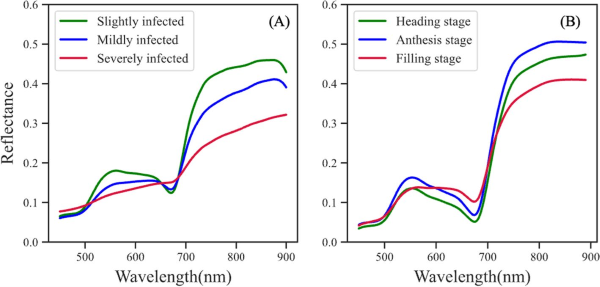 圖11. A.開花階段三種不同RSRD嚴重度稻穗的反射光譜。B.代表與本研究無關(guān)的三種健康水稻稻穗在抽穗、開花和灌漿階段的反射光譜