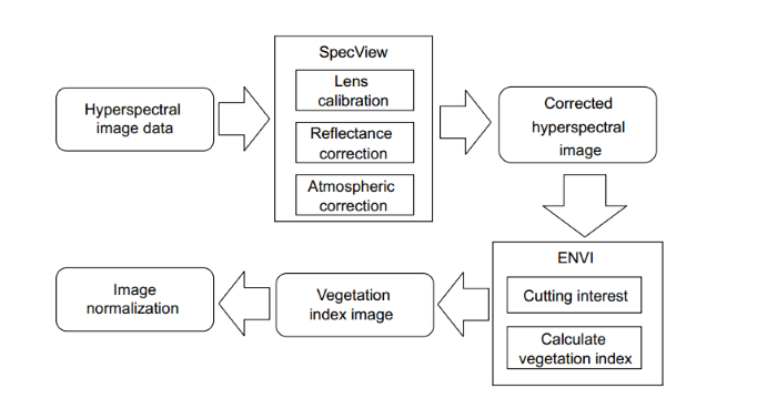 為確保數(shù)據(jù)質(zhì)量,首先對(duì)采集的高光譜圖像進(jìn)行數(shù)據(jù)預(yù)處理(圖2),包括黑白板校正、鏡頭畸變校正和大氣校正,以消除光照變化、設(shè)備噪聲和環(huán)境因素的干擾。同時(shí),利用歸一化植被指數(shù)(NDVI) 計(jì)算紅光(680 nm)和近紅外光(800 nm)反射率,提高植被像素與非植被像素的區(qū)分度。