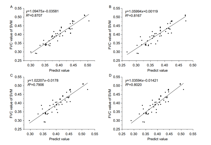 對(duì)四種方法提取的FVC結(jié)果進(jìn)行線性擬合,結(jié)果如圖5所示。其中,SVM提取的FVC值代表通過支持向量機(jī)算法提取的FVC值,而預(yù)測(cè)值則表示不同方法提取的FVC值。從圖5-A至D可以看出,DPK-means算法的擬合精度最高,其R²達(dá)到了0.87。