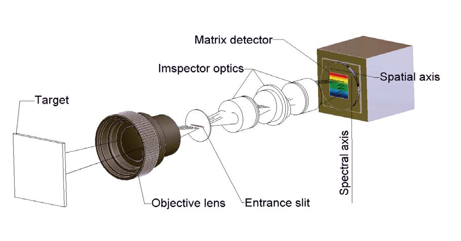 基本工作原理:入射狹縫(Entrance Slit)位于準直系統(tǒng)的前焦面上,樣品(Target)的入射光經(jīng)準直光學(xué)系統(tǒng)準直后,進過棱鏡- 光柵- 棱鏡色散后有成像系統(tǒng)將光能按波長順序成像在探測器的不同位置上。然后在垂直于狹縫方向使被測物與狹縫實現(xiàn)一維相對運動,得到被測物的二維空間信息與光譜信息,得到高光譜數(shù)據(jù)立方體,而結(jié)合多通道光纖束則無需機械掃描運動結(jié)構(gòu),方可實現(xiàn)對多點目標光譜的實時監(jiān)測。