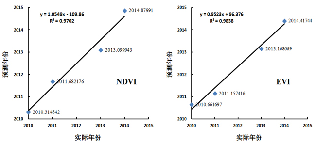 利用圖9所得到的NDVI的建模模型y=-118.48x + 2051.5和EVI的建模模型y=-9.312x +2027.7來預(yù)測右圖2010、2011、2013、2014共4年的小麥種子的年份,預(yù)測年份與實際年份的1:1圖如圖10所示,從圖10可知,預(yù)測年份取整數(shù)部分,無論是NDVI還是EVI,其預(yù)測年份與實際年份完全一致,如取四舍五入取整,NDVI構(gòu)建的模型有兩年的預(yù)測年份超過實際年份1年,EVI構(gòu)建的模型則有1年的預(yù)測年份超過實際年份1年。