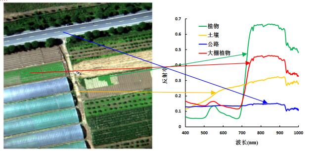 圖4為9月25日天氣為晴,利用無人機(jī)獲取的近地面300 m高度的高光譜圖像及不同地物的光譜反射率曲線。從中可知,植物、土壤、公路、大棚植物等地物光譜曲線差異顯著。在400-920 nm范圍內(nèi)公路的光譜反射率曲線保持較平穩(wěn)的趨勢,土壤的光譜反射率在此范圍內(nèi)呈上升趨勢;400-700 nm范圍內(nèi),大棚植物的光譜反射率高于裸露植物,而在700-100 nm范圍內(nèi),則是裸露植物的光譜反射率高于大棚植物。