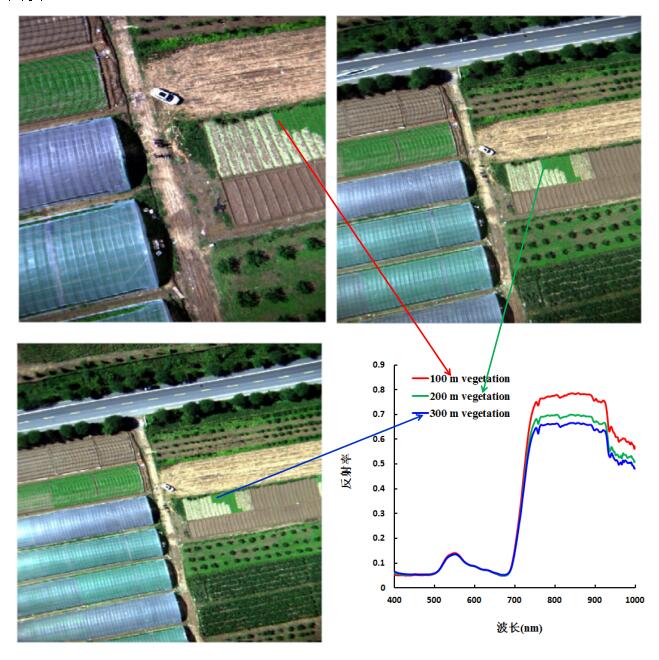 圖2為9月25日,天氣為晴,基于無人機(jī)獲取的三個不同高度的高光譜圖像的(RGB真彩色合成圖),光譜曲線分別為同一研究區(qū)域,100 m、200 m、300 m三個高度的光譜曲線差異。以植被為研究對象,分析同一研究區(qū)域不同高度下光譜曲線的差異。以一個具體的植被象元為例,從圖2中可知,不同高度下植被光譜反射率差異顯著,隨著高度的升高,植被特有的特征“綠峰”降低、“紅谷”升高、“紅邊位置”出現(xiàn)“紅移”。且在400-510 nm范圍內(nèi)光譜反射率隨無人機(jī)飛行高度的升高而升高;在近紅外范圍內(nèi),光譜反射率隨無人機(jī)飛行高度的升高而降低,該這是因為隨著高度升高,空間分辨率降低,圖像中一個像元代表地面的范圍加大,出現(xiàn)混合像元的概率增加。從圖2中可知,隨著無人機(jī)高度的升高,混合像元中土壤所占比例增加,從而造成“綠峰”降低、“紅谷”升高,紅邊位置發(fā)生了“紅移”等現(xiàn)象。