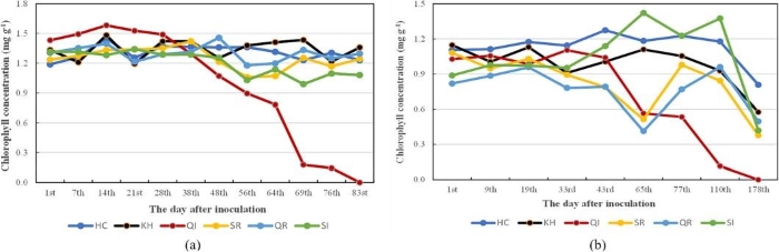圖2 Pinus thunbergii(a)和Pinus massoniana(b)5種侵染狀態(tài)下接種后葉綠素濃度的變化