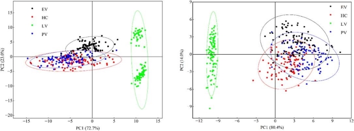 圖5 HC、PV、EV和LV階段的黑松(左)和馬尾松(右)的PCA-S評(píng)分圖