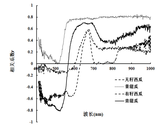 圖7為不同水果的糖度與各波段反射率的相關(guān)系數(shù)圖。從圖中可知,四種不同品種的水果,其光譜反射率對糖度的響應(yīng)差異較大。對兩個品種的西瓜而言,無籽西瓜在400-600 nm范圍內(nèi),其光譜反射率與含糖量呈負相關(guān)關(guān)系,在600-1000 nm范圍內(nèi),其光譜反射率與含糖量呈正相關(guān)關(guān)系,其中600 nm處為零界點;有籽西瓜在400-630 nm范圍內(nèi),其光譜反射率與含糖量呈負相關(guān)關(guān)系,在620-700 nm與820-1000 nm范圍內(nèi),其光譜反射率與含糖量呈正相關(guān)關(guān)系,在700-820 nm范圍內(nèi),其光譜反射率與含糖量相關(guān)性較小,接近為0;在660 nm附近,有籽和無籽西瓜的光譜反射率與含糖量形成一個峰值,因此,660 nm可作為西瓜瓜瓤對糖度的一個特征響應(yīng)波段。而對于兩個品種的甜瓜,黃色甜瓜的光譜反射率與糖度在400-1000nm范圍內(nèi)呈正相關(guān)關(guān)系,但在520 nm附近出現(xiàn)一個谷值,該谷值為0,即與糖度相關(guān)性為0;在550-1000 nm范圍內(nèi),黃色甜瓜的光譜反射率與糖度相關(guān)性較為穩(wěn)定,保持在0.8左右;青色甜瓜在400-570 nm范圍內(nèi),其光譜反射率與含糖量呈負相關(guān)關(guān)系,在570-1000 nm范圍內(nèi),其光譜反射率與含糖量呈正相關(guān)關(guān)系,與黃色甜瓜類似,在520 nm附近出現(xiàn)一個谷值,該谷值為0.8,即相關(guān)系數(shù)為0.8;青色甜瓜的光譜反射率與含糖量的零界點在570 nm,即相關(guān)系數(shù)為0。