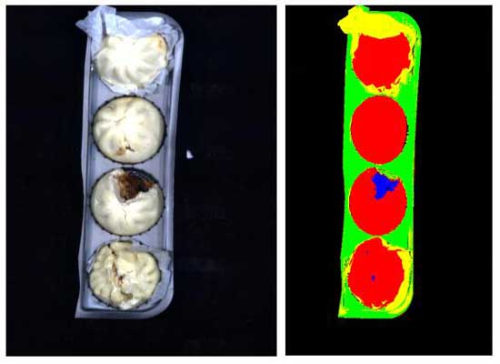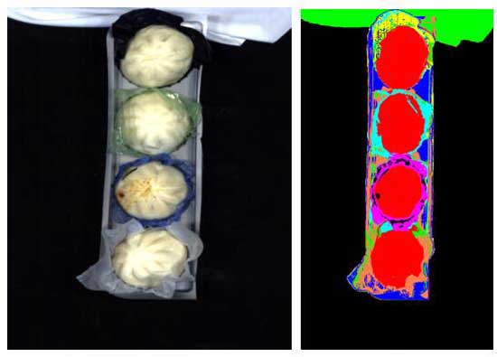 本次實驗對包子的混雜金屬、混雜玻璃片、混雜塑料片、包子完整情況(是否有餡露出來)、有無包裝紙、有何種顏色的包裝紙進行了初步的檢測,目的是為了分辨出包子中混雜的金屬、玻璃片、塑料片,以及是否露餡、是否包含包裝紙和用何種包裝紙對其進行包裝。