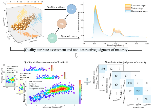 Zou et al. (2024)對紅心獼猴桃在開花、結(jié)果、成熟和采收過程進行了研究,提出了一種將熒光高光譜成像(FHSI)技術與化學計量學相結(jié)合的獼猴桃品質(zhì)屬性評價和成熟度識別的無損方法(圖4)。該研究發(fā)現(xiàn)隨著獼猴桃成熟,F(xiàn)HSI技術捕獲的獼猴桃熒光強度逐漸減弱。在獼猴桃品質(zhì)屬性(DMC、硬度和SSC)的預測中,熒光高光譜技術結(jié)合PLSR模型準確預測了獼猴桃的內(nèi)在品質(zhì)特征。在使用深度學習模型進行獼猴桃成熟度(未熟、成熟和過熟)的三分類中,深度學習相對于機器學習模型具有一定的優(yōu)勢。
