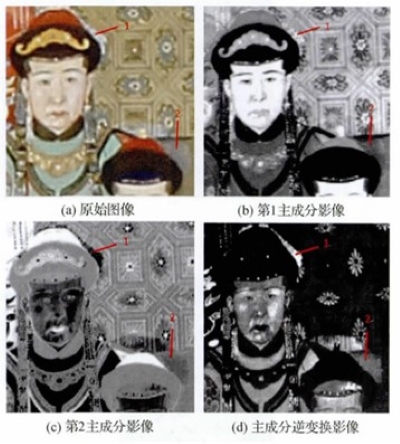 郭新蕾等人以《崇慶皇太后八旬萬(wàn)壽圖》為研究對(duì)象,利用短波紅外(1000~2500 nm)高光譜數(shù)據(jù)結(jié)合多種光譜匹配算法(如光譜角匹配、光譜信息散度)和主成分分析技術(shù),成功實(shí)現(xiàn)了顏料成分的精準(zhǔn)識(shí)別與分布分析,并通過背景剝離增強(qiáng)弱信息,提取了底層涂抹痕跡等隱藏信息。以圖4中人物頭冠為例,圖中所標(biāo)識(shí)的1、2分別為涂抹信息,經(jīng)過主成分分析可以發(fā)現(xiàn),涂抹痕跡得到了明顯加深,隱藏信息得到了有效提取。結(jié)果表明,高光譜技術(shù)在顏料混合分析和弱信號(hào)增強(qiáng)方面具有顯著優(yōu)勢(shì)?。