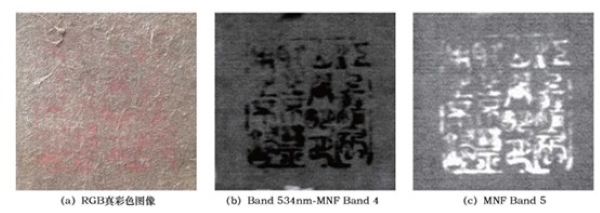 周新光等人研究了高光譜圖像系統(tǒng)在提取傳統(tǒng)書畫作品中模糊印章信息方面的應(yīng)用。文章采用350-1000 nm高光譜成像技術(shù),通過最小噪聲分離方法處理數(shù)據(jù),顯著提升印章辨識(shí)度(圖11)。該技術(shù)還能揭示修復(fù)痕跡,為印章真實(shí)性及文物藝術(shù)價(jià)值研究提供科學(xué)依據(jù),解決了模糊不清印章的辨識(shí)難題。