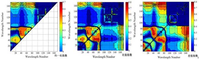 將波長(zhǎng)從400-1000nm的所有波段反射率構(gòu)建歸一化指數(shù)、比值指數(shù)、差值指數(shù)分別與各水質(zhì)參數(shù)進(jìn)行相關(guān)分析,得到水質(zhì)參數(shù)與各波段比值的相關(guān)系數(shù)分布圖。以水質(zhì)參數(shù)總氮為例,圖5為水質(zhì)參數(shù)總氮與歸一化指數(shù)、比值指數(shù)、差值指數(shù)任意兩波段組合的相關(guān)系數(shù)分布圖。