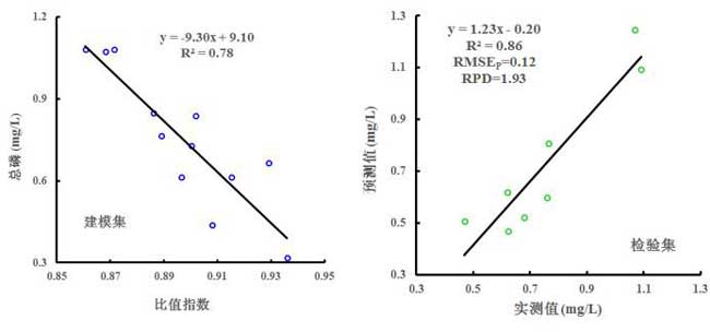 本研究中星云湖和茅洲河分別有5和15個(gè)采樣點(diǎn),采樣點(diǎn)按3:2的比例運(yùn)用含量梯度法[21]選出建模集和檢驗(yàn)集。水質(zhì)參數(shù)監(jiān)測(cè)模型運(yùn)用決定系數(shù)R2、均方根誤差(Root Mean Square Error,RMSE)、預(yù)測(cè)與偏差的比率(Ratio of Prediction to Deviation,RPD)進(jìn)行精度評(píng)價(jià),其中R2越大,RMSE和RPD越小,模型的準(zhǔn)確性越高。當(dāng)RPD> 2.0的值表示穩(wěn)定且準(zhǔn)確的預(yù)測(cè)模型,RPD值介于1.4和2.0之間,表明可以模型穩(wěn)定性一般,預(yù)測(cè)能力不穩(wěn)定,RPD <1.4時(shí)表明模型預(yù)測(cè)能力差。