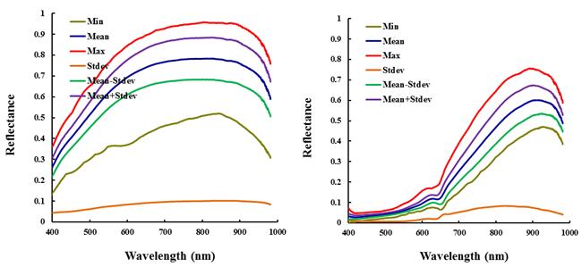 圖4和圖5為新會2013年和2014年陳皮里外層部分在1000 nm-2500nm范圍內(nèi)的光譜反射率的最大值、最小值、均值、方差、均值±方差曲線。