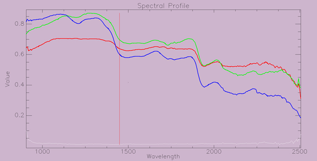 樣品的典型高光譜如圖1所示。紅色為8號(hào)樣品、藍(lán)色和綠色分別為9號(hào)、10號(hào)樣品。
