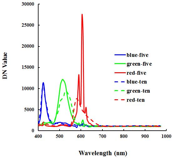 2.3華為p8、iphone 5S、iphone 6 plus在顯微放大5倍、10倍條件下,其在紅綠藍三顏色的光譜變化