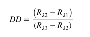 隨著病害的發(fā)展,VNIR光譜曲線逐漸變平。為了提高所提取特征的靈敏度,將多個(gè)波段組合在一起來表示反射率曲線逐漸平坦的趨勢(圖2C)。因此選擇雙差指數(shù)(DD)的形式來描述變異強(qiáng)度,公式如下所示。其中,Rλ1、Rλ2、Rλ3為吸收谷或反射峰的敏感帶反射率,按波長的遞增順序排列。