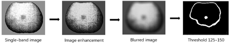 圖3顯示了隨機選擇樣本的單波段圖像處理流程。最后,對形態(tài)學處理后的圖像選擇合適的閾值分割出特征區(qū)域,并用于掩模處理。
