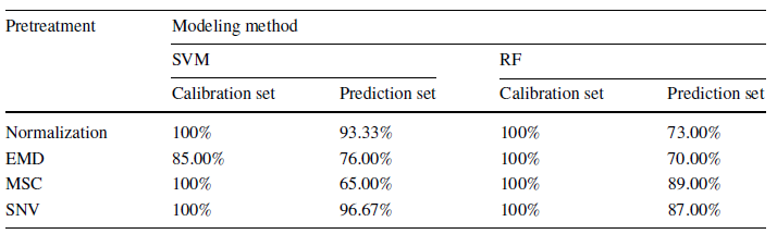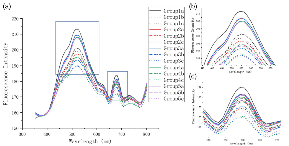 表1表示了SVM和RF模型用于區(qū)分72小時后挫傷的樣本的不同挫傷水平的準確性。從表1中可以看出,當選擇歸一化、EMD和SNV的預處理方法時,SVM模型在預測集中的結(jié)果明顯好于RF模型的結(jié)果。字母a至c表示三個瘀傷級別:輕微和嚴重,對應于A組至C組。圖4a顯示了不同損傷程度的樣品在損傷后不同時間熒光光譜的變化。從圖4a可以看出,在520nm和680nm附近有兩個明顯的尖峰。圖4b和圖4c是在520nm處的放大圖像,680 nm波長處。500-600 nm的波形代表核黃素、多酚和黃酮類化合物的合成反應。與表皮組織相比,水果中的黃酮類化合物存在于較深的表層,這是由于它們與角蛋白的結(jié)合相對較慢,因此熒光響應值較小。葉綠素吸收350-500 nm和600-700 nm兩個波段的光,并在680 nm和740 nm發(fā)射。680 nm附近的熒光峰應為葉綠素吸收峰。從圖4中可以看出,兩個峰值處的熒光信號強度隨著瘀傷程度的增加而變?nèi)酢M饨鐡p傷造成表皮組織細胞壁破裂,破壞了冠梨內(nèi)部成分,導致胡蘿卜素和葉綠素含量逐漸降低,熒光強度相應逐漸減弱。另外,在圖4b中發(fā)現(xiàn),C組挫傷樣本的熒光光譜在520 nm處的峰值處熒光強度較低。推測在樣品被挫傷后的第一天內(nèi)類黃酮在很大程度上損失。