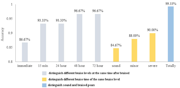 圖5顯示了SVM建模方法對所有樣本在同一時間點(即刻、15 min、24 h、48 h、72 h)區(qū)分不同損傷程度、同一損傷程度不同損傷時間點(健全、輕微、嚴重)區(qū)分損傷梨和非損傷梨的準確性。