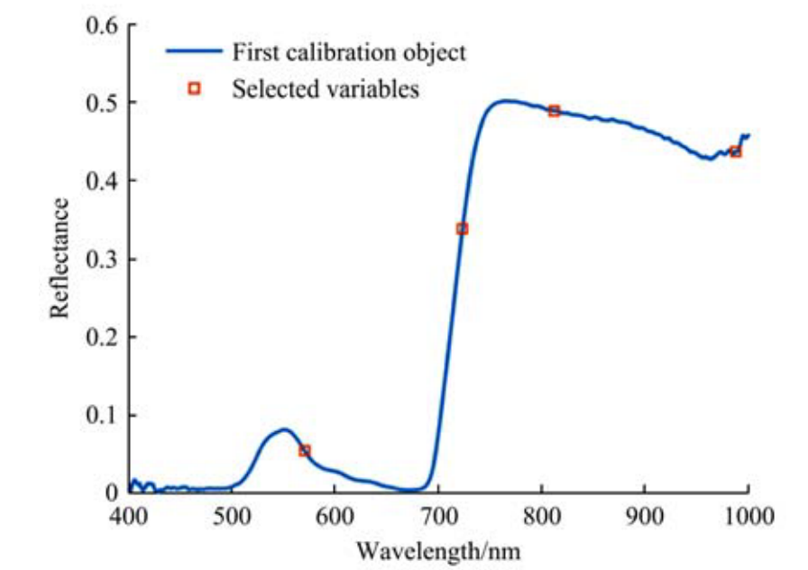 利用Savitzky-Golay卷積平滑算法對400 ~ 1000 nm的反射率光譜數(shù)據(jù)進(jìn)行平滑處理,并利用MPA提取特征波段用于水稻氮素含量反演。圖3為MPA算法的特征波段選擇結(jié)果,最 佳特征波段為570、723、811和987 nm。本研究提取的特征波段主要集中在綠波段、紅邊位置、近紅外波段范圍。