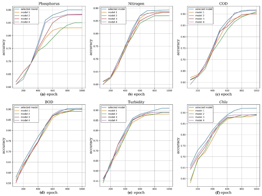 圖3 不同水質(zhì)參數(shù)和訓(xùn)練迭代的精度圖
