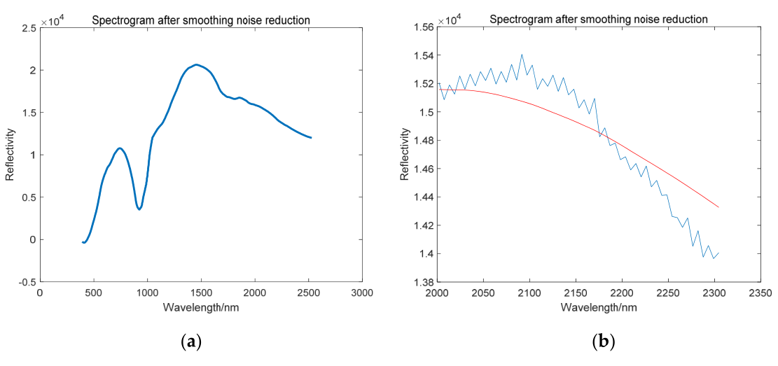 圖2 小波變換與降噪結(jié)果。L6全波段平滑圖(a)和2002 ~ 2304 nm平滑效果圖(b)