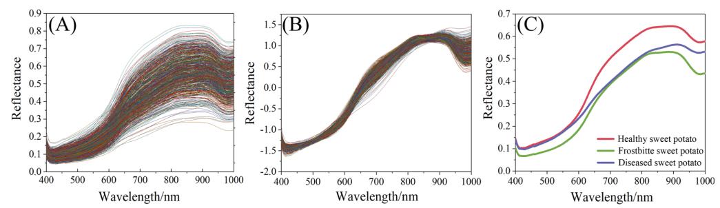圖2 甘薯光譜曲線:(A)原始光譜,(B)SNV預(yù)處理后的光譜,(C)平均光譜