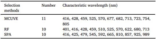 表1 通過MCUVE、RF和SPA方法選擇的特征波段