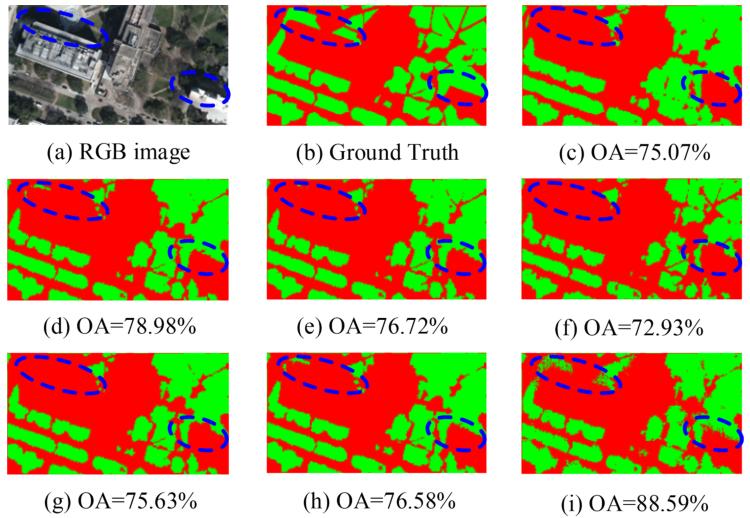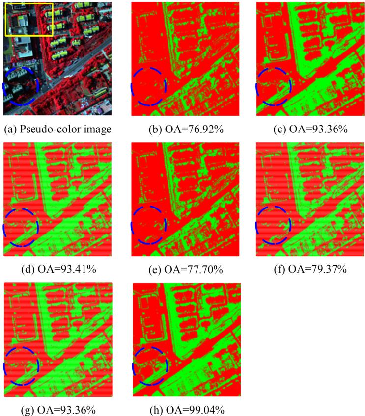 圖4進一步驗證了HSVI在復(fù)雜環(huán)境下提取植被的優(yōu)勢。橢圓區(qū)域表示植被被遮蔽的地方,矩形區(qū)域包含容易被誤分類為植被的合成表面。從圖4c、f和g可以看出,由于陰影的干擾,NDVI、SR和WDRVI的植被提取結(jié)果較差。在圖4d、e和h中,NDVI、SR和WDRVI能夠從陰影中提取植被。然而,他們很容易將其他特征誤認為植被。相比之下,HSVI的植被提取效果*好。結(jié)果表明,HSVI中的EVI有效增強了陰影植被,避免了與合成材料的光譜混淆。