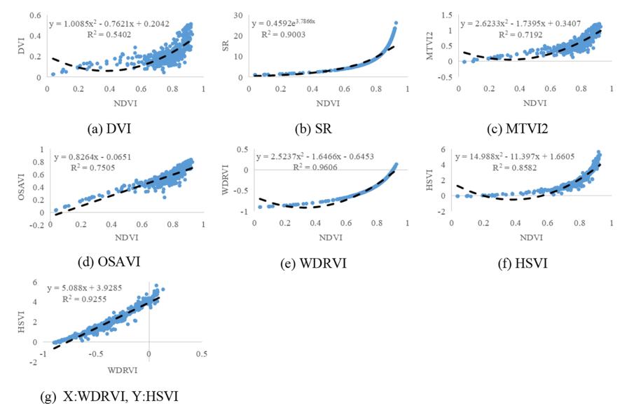 為了驗證HSVI的不敏感性,我們比較了其他VIs與NDVI的相關(guān)性。從圖6a、c、d的散點圖分布可以看出,DVI、MTVI2、OSAVI與NDVI的相關(guān)性非常低,分布不均勻。結(jié)果表明,它們的不敏感性弱于NDVI。由圖6b、e、f可知,SR、WDRVI、HSVI與NDVI具有較高的相關(guān)性,擬合函數(shù)為曲線分布。結(jié)果表明,它們的不敏感性大于NDVI。同時,從圖6g可以看出,HSVI可以達到與當(dāng)前最佳指數(shù)相同的水平。