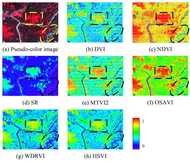 圖3a表明,橢圓區(qū)域有大量的陰影植被。然而,在圖3b、e、f中,該區(qū)域DVI、MTVI2和OSAVI的植被提取結(jié)果是不完整的。如圖3c、d、g所示,利用NDVI、SR、WDRVI進行植被提取效果更好,植被提取更完整。在圖3h中,HSVI的植被提取最為完整。
