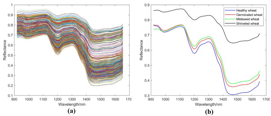 圖4 籽粒光譜。所有小麥籽粒的光譜(a);小麥籽粒在四種不同狀態(tài)下的平均光譜(b)。