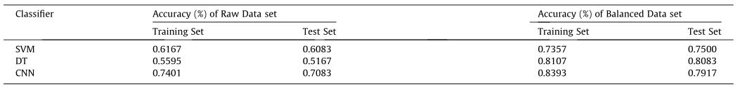 表4給出了分類器在原始數(shù)據(jù)集和平衡數(shù)據(jù)集上的對比實驗結果。數(shù)據(jù)平衡后,所有分類器的測試集的準確率都得到了提高。其中,準確率提高幅度最小的分類器是CNN模型,準確率提高了8.34%。提升*大的是DT模型。準確率從51.67%提高到80.83%,這也表明分類器受樣本是否平衡的影響明顯。從圖7可以看出,數(shù)據(jù)擴展后,每個類別的誤分類次數(shù)都在減少。雖然這三種分類器從增加的數(shù)據(jù)樣本中學習到了更多的特征,準確率也有了很大的提高,但最終測試集的準確率仍然不能令人滿意。此外,CNN模型還存在過擬合的風險,其訓練集準確率與測試集準確率相差超過3%。這可能是由于訓練樣本較少,CNN模型無法學習到更深層的特征,導致過擬合。因此,需要更多的樣本來提高分類器的識別能力。