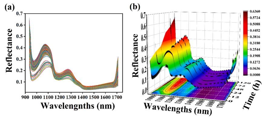 圖3為不同腌制階段樣品的光譜反射率變化圖。在圖3a中,不同腌制時(shí)間樣品的光譜反射率變化趨勢(shì)大致一致。但在1100 nm之前,0 h樣品的反射率值與其他樣品相差很大。可以得出結(jié)論,腌制過程的持續(xù)時(shí)間將是導(dǎo)致反射率變化的重要因素。在960 nm、1190 nm和1430 nm處可以觀察到三個(gè)明顯的吸收峰。在圖3b中,平均光譜反射率呈現(xiàn)出與腌制時(shí)間相關(guān)的變化規(guī)律,在960 nm左右,隨著腌制時(shí)間的延長(zhǎng),反射率顯著增加,說明樣品內(nèi)部水分有所降低。在1190 nm左右,反射率逐漸增大,說明海參樣品中的脂質(zhì)和蛋白質(zhì)含量在腌制過程中損失較慢。