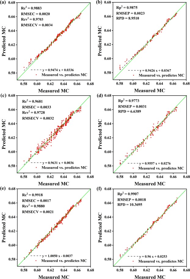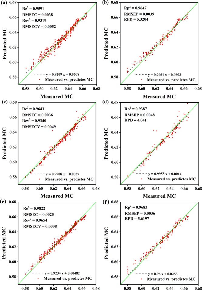 圖5 HSI-W-DL模型在校準(zhǔn)集(a)和預(yù)測(cè)集(b)、LF-NMR-WDL模型在校準(zhǔn)集(c)和預(yù)測(cè)集(d)、W-FDL模型在校準(zhǔn)集(e)和預(yù)測(cè)集(f)的模型精度。