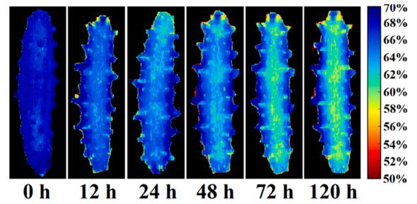 基于HSI-CCS-DL的MC可視化如圖8所示。可以清晰地顯示樣品淺表面同一階段內(nèi)不同點(diǎn)的MC差異以及不同階段間的變化規(guī)律。海參沒有腌制時(shí),基本呈藍(lán)色,說明其MC最高。隨著腌制時(shí)間的延長(zhǎng),中間區(qū)域的顏色由藍(lán)色變?yōu)榫G色,最終變?yōu)辄S色,同時(shí)黃色區(qū)域逐漸向邊緣擴(kuò)展。