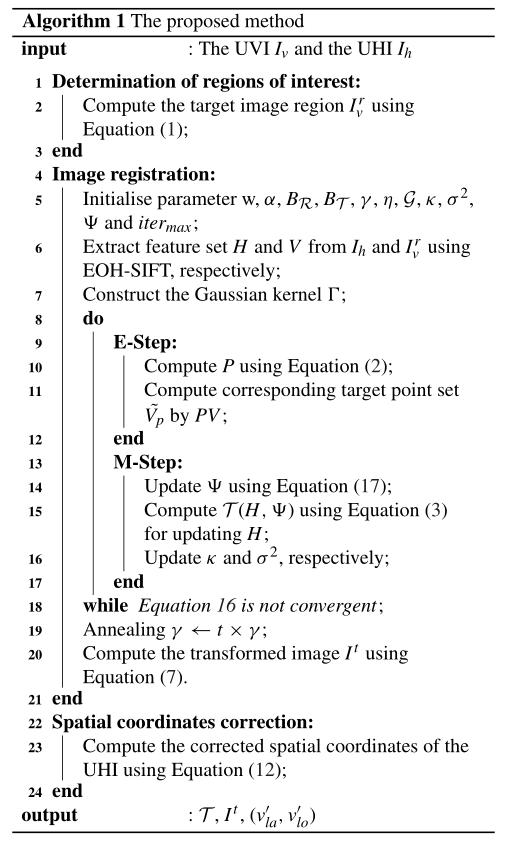 其次,在獲取參考值后,利用UVR對UHI進(jìn)行圖像配準(zhǔn)。圖像配準(zhǔn)的目的是對高光譜影像進(jìn)行變換,使其與目標(biāo)影像UVR對齊。將UHI在更精確的地理坐標(biāo)上對齊,以實(shí)現(xiàn)樹種的定位。主要分為以下三步:(1)特征點(diǎn)提取。在基于特征的方法中,特征提取是點(diǎn)集配準(zhǔn)的關(guān)鍵。本研究采用基于SIFT-like scale space(EOH-SIFT)的Edge Oriented Histogram descriptor(EOH)進(jìn)行特征點(diǎn)集提取;(2)特征點(diǎn)集配準(zhǔn)。采用期望*大化(Expectation maximization, EM)算法來完成圖像配準(zhǔn)過程,該過程在兩步之間交替進(jìn)行。EM算法的這兩步分別對應(yīng)于對應(yīng)估計(jì)和變換更新;(3)圖像變換。為了解決圖像的幾何畸變和非剛性畸變,我們利用薄板樣條插值(Thin plate spline, TPS)來模擬更廣泛的變換。