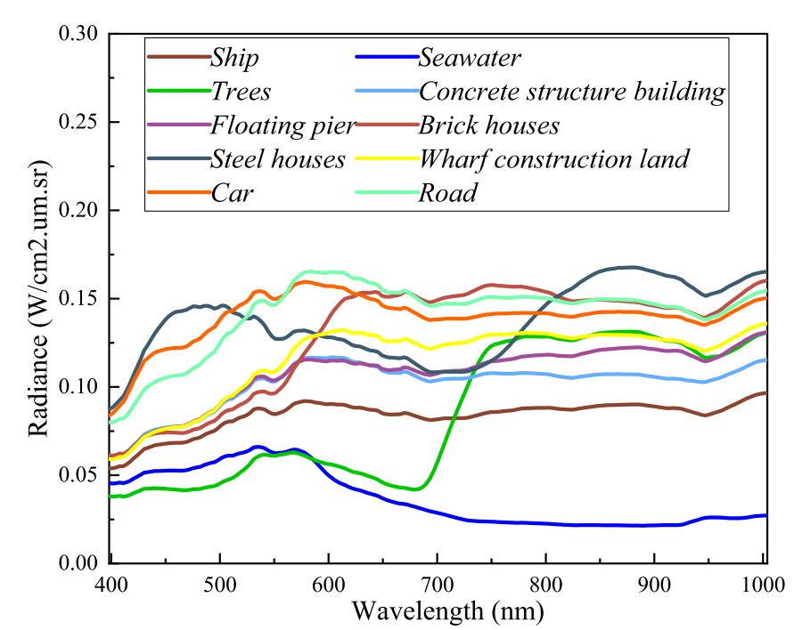 中國石油大學(xué)孫根云教授團(tuán)隊(duì)選取了位于中國山東省青島市西海岸新區(qū)的三個(gè)研究區(qū)(圖1)。在此研究中構(gòu)建了具有高分類挑戰(zhàn)的QUH數(shù)據(jù)集。QUH數(shù)據(jù)集包含三個(gè)子數(shù)據(jù)集,即QUH-唐島灣、QUH-青云和QUH-平安,均由安裝在無人機(jī)平臺(tái)上的高光譜傳感器Gaiasky mini2-VN成像光譜儀(江蘇雙利合譜科技有限公司)獲取,規(guī)格如圖2所示。三個(gè)數(shù)據(jù)集的詳細(xì)飛行參數(shù)信息如表1所示。QUH-唐島灣、QUH-青云、QUH-平安數(shù)據(jù)集詳細(xì)的土地覆蓋分布及相應(yīng)的光譜曲線分別如圖3和圖4、圖5和圖6、圖8和圖9所示。然而,QUH-青云數(shù)據(jù)集的某些區(qū)域被建筑物陰影遮擋,包括樹木、汽車和瀝青道路等類別(圖7)。