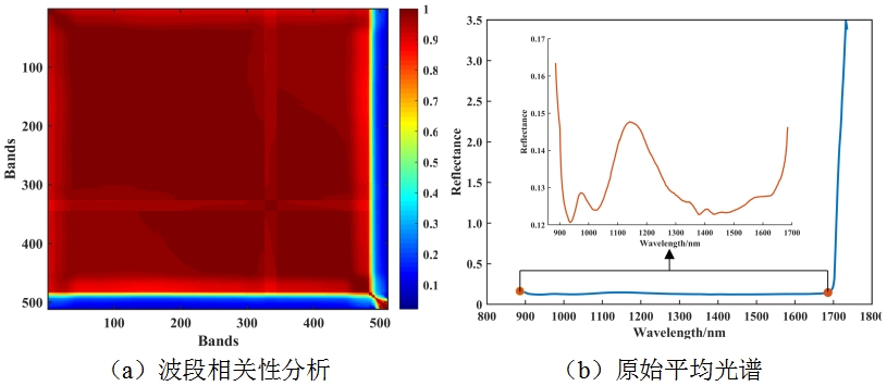 圖1b(藍色線條)為HSI捕獲到的原始平均光譜曲線,可以明顯看到在整個光譜區(qū)域沒有特異的波峰波谷。為了找出峰谷突出的區(qū)域,分析了光譜波段之間的相關性。對于維度為(x, y, λ)的高光譜數(shù)據(jù),轉(zhuǎn)換為(z = x × y, λ),并對z進行相關性分析,結(jié)果如a所示。圖中顯示紅色區(qū)域的波段在整個波段中占比94.34%,其余顏色區(qū)域總共占比5.66%。為了***限度地保留 “純凈數(shù)據(jù)”,防止其它顏色區(qū)域數(shù)據(jù)的干擾,通過查詢顏色欄數(shù)據(jù)并結(jié)合波段得知紅色與其余顏色區(qū)域的相關性分界點為0.8(波段:483)。隨后,將相關性小于0.8的30個波段從數(shù)據(jù)分析中剔除,從而***了1685.47-1735.34 nm的光譜區(qū)域。得到的光譜曲線如圖1b(紅線)所示。該過程獲得的光譜數(shù)據(jù)(150×483)用于后續(xù)的模型建立和分析。