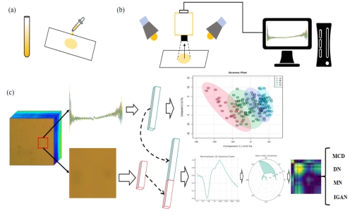 本研究收集了2020年11月至2022年1月在山東大學(xué)齊魯醫(yī)院診斷為各種腎小球疾病的患者的尿液樣本。病例被分為四組不同的組,每組包含30例:微小改變?。∕CD)、糖尿病腎?。―N)、膜性腎病(MN)和IgA腎病(IgAN)。對于每個(gè)樣本,取5 mL尿液,以1500 rpm離心5分鐘。隨后,將0.5 mL的上清液小心地轉(zhuǎn)移到一個(gè)干凈的載玻片上。共計(jì)120份尿液樣本。所有參與患者均獲得知情同意,本研究獲得了山東大學(xué)齊魯醫(yī)院倫理委員會的倫理批準(zhǔn),確保符合倫理標(biāo)準(zhǔn)和患者保密。采用線掃描推掃高光譜成像裝置(GaiaMicro-V10E-DY)在反射模式下采集尿液上清樣本的高光譜圖像。該設(shè)備的詳細(xì)配置如圖2所示。