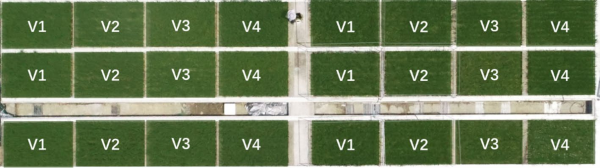 圖1.2019年和2020年試驗小區(qū)的實驗區(qū)域地圖,分別展示了2019年四個品種(V1: 武運粳23號,V2: 武運粳24號,V3: 武運粳7號,V4: 南粳44號)和2020年另外四個品種(V1: 揚農(nóng)1號,V2: 南粳9108號,V3: 南粳5055號,V4: 淮稻5號)的試驗小區(qū)布局