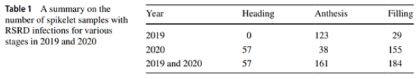 由于豐滿緊湊的粳稻品種更易感染RSRD,我們選擇了江蘇省常見的八個粳稻品種進行實驗(2019年:武運粳23號、武運粳24號、武運粳7號和南粳44號;2020年:揚農(nóng)1號、南粳9108號、南粳5055號和淮稻5號)。在2019年和2020年的實驗小區(qū)中,RSRD自然發(fā)生。