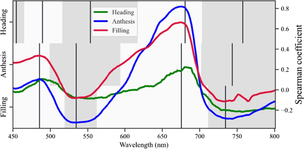 圖4.不同生長階段(綠色:抽穗,藍色:開花,紅色:灌漿)下疾病DS與450至800nm波長處反射率之間的Spearman相關(guān)系數(shù)?;疑桶咨尘胺謩e代表負相關(guān)和正相關(guān)。黑色垂直線對應(yīng)于灰色或白色相關(guān)域中的最大系數(shù)(上排:抽穗,中排:開花,下排:灌漿)