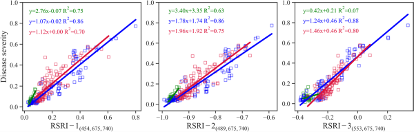 Spearman相關(guān)曲線顯示,RSRD的嚴重程度在紅色區(qū)域最可量化。此外,所有生長階段在NIR區(qū)域都出現(xiàn)了一致的相關(guān)性。基于這些特征,分別從紅色和NIR區(qū)域選擇了兩個波段作為構(gòu)建RSRI方程的部分。紅色區(qū)域的最優(yōu)波段分別為抽穗階段的680nm和開花及灌漿階段的675nm(圖4)。NIR區(qū)域最敏感的波段為751nm、743nm和734nm。因此,確定了紅色區(qū)域的共同波段675nm和NIR區(qū)域中位波長740nm來填充RSRI方程。RSRI的第三個波段從抽穗階段的剩余代表性波段中選擇,包括454nm、489nm和553nm。構(gòu)建了三個候選指數(shù),分別命名為RSRI-1、RSRI-2和RSRI-3,以進行進一步比較。