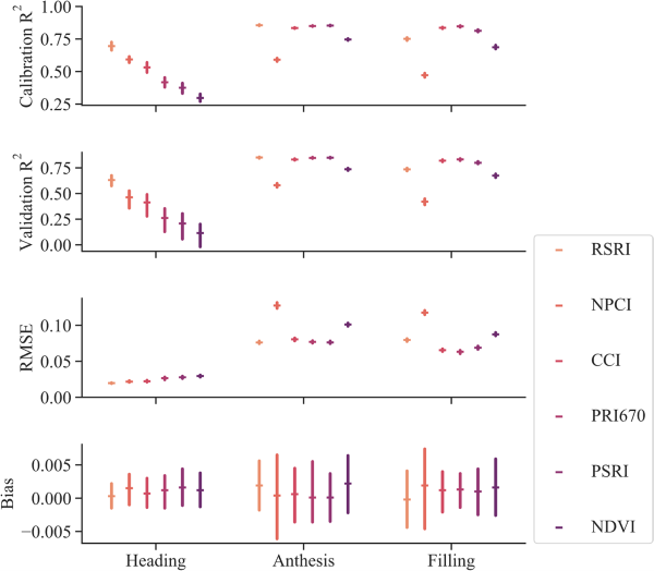 圖9.在不同生長階段(左列:抽穗,中列:開花,右列:灌漿)對RSRI和現(xiàn)有SIs在DS(疾病嚴重度)量化中的校準準確性(R²)、驗證準確性(R²)、RMSE和偏差的比較。每一百輪評估的平均值(水平條)伴隨著置信區(qū)間(垂直條)。