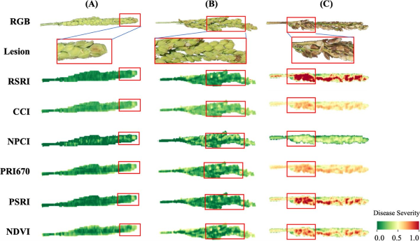 本研究確定了多個生長階段對RSRD的光譜響應(yīng)差異,并構(gòu)建了一個新的指數(shù)RSRI,該指數(shù)對多個物候階段的RSRD敏感。結(jié)果表明,灌漿階段綠色和近紅外區(qū)域的反射率對DS的敏感性顯著低于開花階段。RSRI的優(yōu)化表明,藍色波段的加入提高了抽穗階段SI對DS的敏感性,增強了早期疾病檢測能力。與NPCI、CCI、PRI670、PSRI和NDVI相比,RSRI在早期感染階段對DS的敏感性最高,并且從抽穗到灌漿階段在DS估計中表現(xiàn)最為穩(wěn)定(抽穗:R² = 0.65,RMSE = 0.02;開花:R²= 0.84,RMSE = 0.08;灌漿:R²= 0.78,RMSE = 0.08)。此外,基于RSRI的模型比之前研究的SIs更能準確地映射輕微、輕度和嚴重感染樣本的病斑分布。RSRI在早期感染階段的DS估計和病斑映射可以為作物保護和病理學研究提供有效的參考。